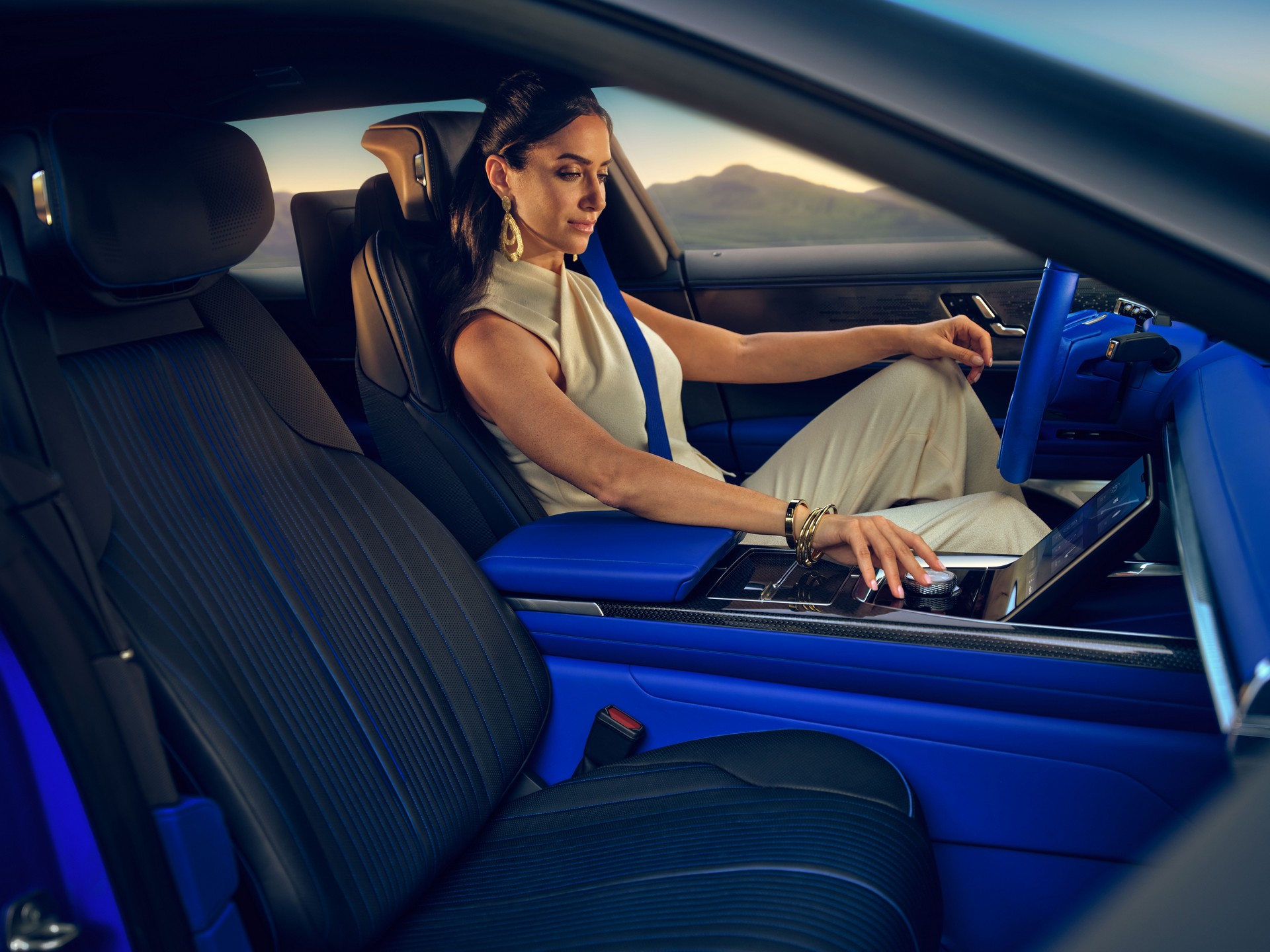 “行旅致美”包括了用车日子的方方面面, 从全体的视觉出现,到部分的丰厚细节,再到一系列精心编列的交互体会与“场合感”,旨在营建特别的用车体会。这种因地制宜般的规划理念考量了人车之间一切的交互场景,使一般的车内元素也能表达明显的特性。