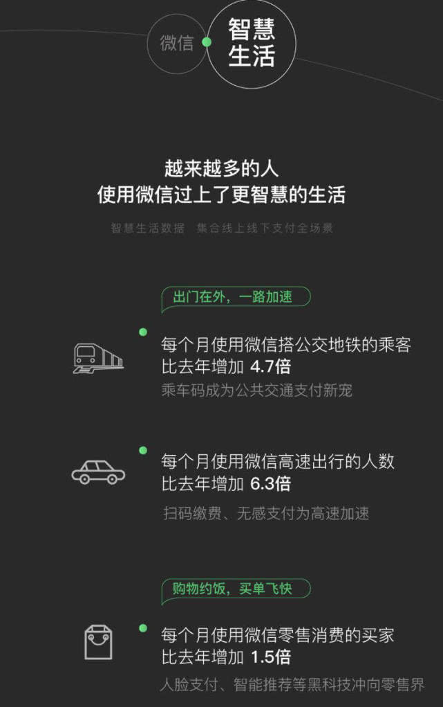 才智日子方面,每个月运用微信搭公交地铁的乘客比2017年添加4.7倍,每个月运用微信零售消费的买家比2017年添加1.5倍。