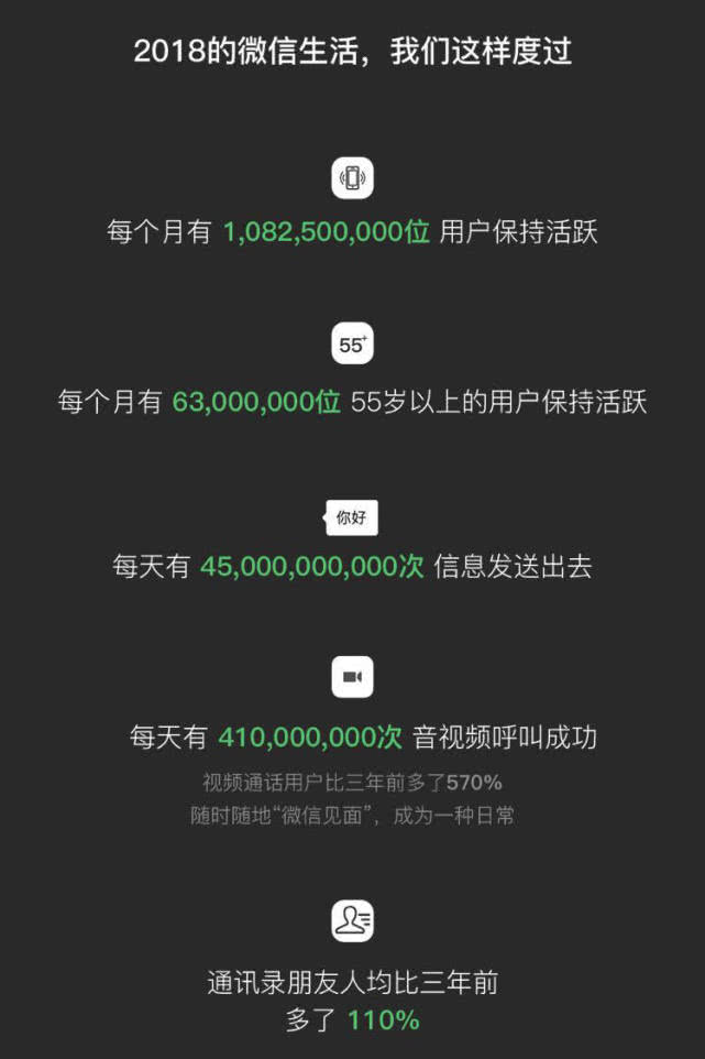 在今天举办的2019微信公开课PRO上,微信发布了《2018微信年度数据陈述》:到2018年9月,微信月活用户到达10.82亿。每天发送音讯450亿次,同比添加18%。每日音视频通话4.1亿次,同比添加100%。交际方面,2018年比较2015年,人均加老友数量添加110%,朋友圈日发布视频数量添加480%。