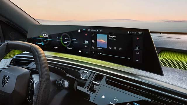 美丽团队决定将 i-Cockpit 的三个根本元素中的两个结合在一起:平视显示器和大型中心触摸屏。这些现在集成到一个弧形全景屏幕中,并带有一个 21 英寸高清面板,从仪表板左边延伸到中控台。